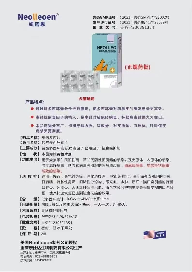 主要成分:盐酸多西环素、抗病毒因子、止咳因子、粘膜保护剂